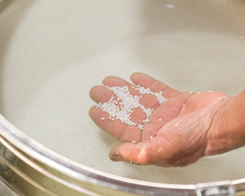 入社後は、酒づくりの下準備を行う“釜場(かまば)”に入りました。精米された米を洗い、水につけて吸水させ、蒸すという工程です。米の種類、その日の気温・湿度などの条件によって水の吸い方はまったく違い、最初はうまくいかないことの連続で…。今日の失敗を知識とし、「明日はこうしてみよう」と新たな試みを重ねながら技術を身に付けてきました。ゼロから酒造りを覚えただけに、先輩の助手としてでなく、初めて一人で洗って蒸した米が商品になったときはしみじみと嬉しかったですね。その酒は飲まずに今でも自宅に飾ってあります。